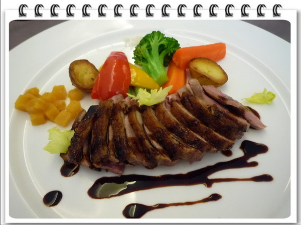 噹噹~終於上主菜了,這是「香煎櫻桃鴨胸襯薑味糖漬鳳梨」,一上菜就讓人覺得份量滿點!!已經先幫我們切成一片片方面食用,總共有10片,鴨胸肉新鮮軟嫩,搭配的醬汁恰到好處不會蓋過鴨胸的味道,配菜的馬鈴薯蔬菜及糖漬鳳梨更有畫龍點睛的效果。