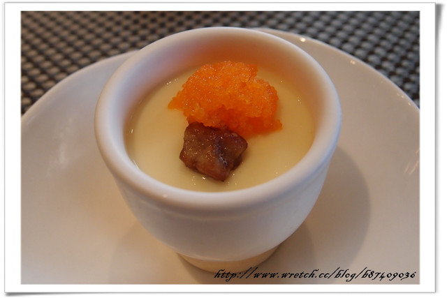 接下來的蒸蛋 我猜是半成品在鐵板上加熱蒸過 最後主廚再加上魚卵點綴