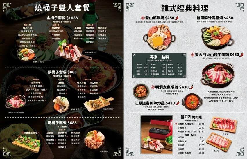 截取自官網的菜單,燒桶子可以單點,也能選擇套餐,共有金銀鐵三種——雖然上面寫的是雙人套餐,但我覺得兩個人吃會太多XD。