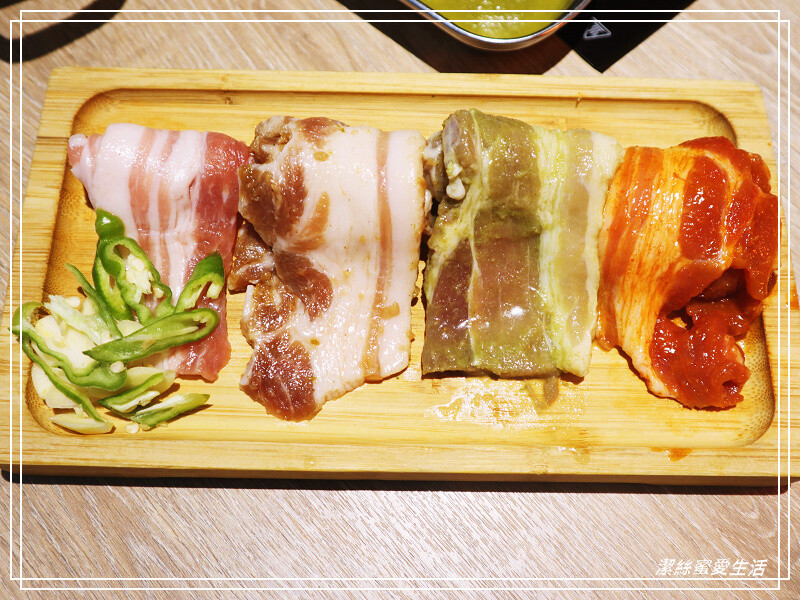 由四種不同口味組成的五花肉條,分別是原味/梨汁/青蒜/辣醬,今天拿到的這梨汁五花肉看起來有點太肥XD。