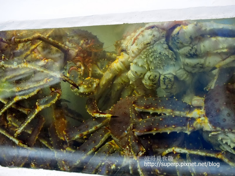 水族箱內放滿了碩大的活帝王蟹。基本上第一次來的人都會搶著抓帝王蟹拍照,而且一定要打卡上傳到臉書來讓朋友們流口水才甘心XD