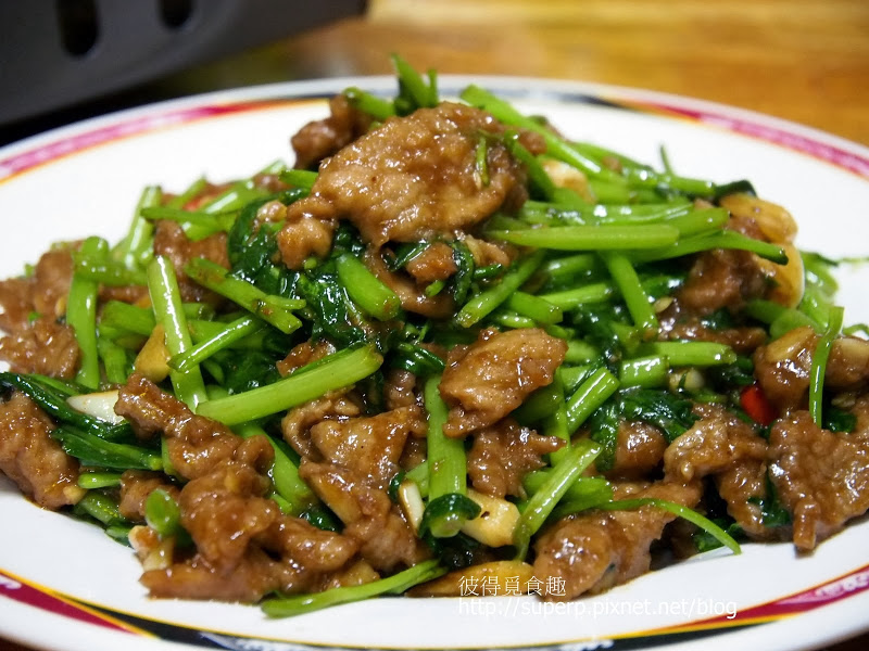 沙茶空心菜牛肉$180(空心菜翠綠,牛肉很嫩,沙茶醬汁很香。好吃,大推!)