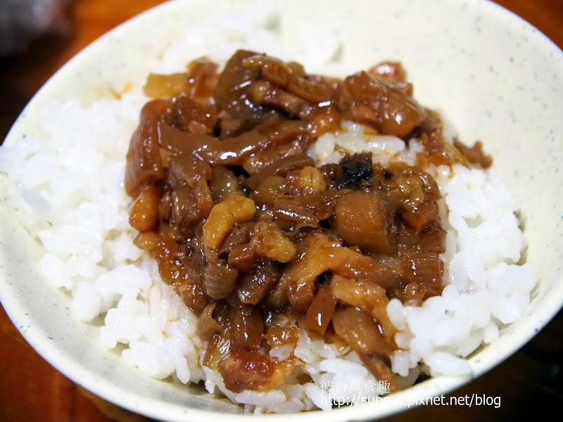 滷肉飯(這是免費吃到飽的。要多少飯或滷肉都隨便加。是我最喜歡的全肥風格,可惜調味有點過甜,不然就大推了,因此只有推的水準。)