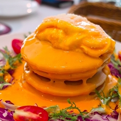 使用小茴香、奧勒岡等醃漬過的炸雞,別看它外表炸得焦黑酥脆,但雞肉吃起來可是又軟嫩又多汁,而且足足就有三大塊,麵粉裏得薄透,連味道都好足夠,難怪會這麼受客人的歡迎,雖說賣相也許不怎麼可口,但它著實美味得緊,配上鬆餅再淋些楓糖,鹹與甜的結合,交織出特別又過癮的美妙滋味