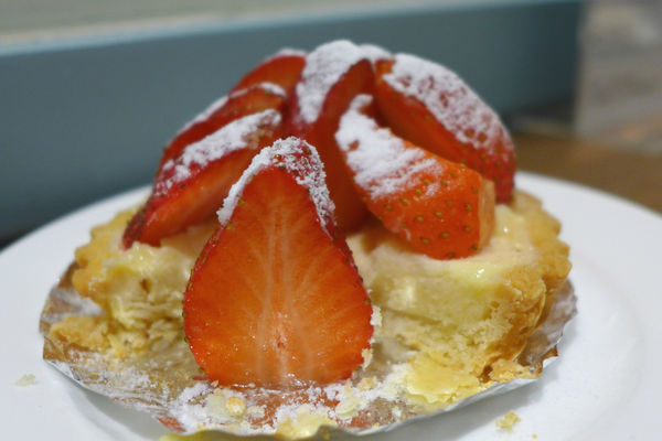 這顆草莓塔很棒耶!!!!在當季吃更能吃到新鮮、一點都不酸的草莓啊!