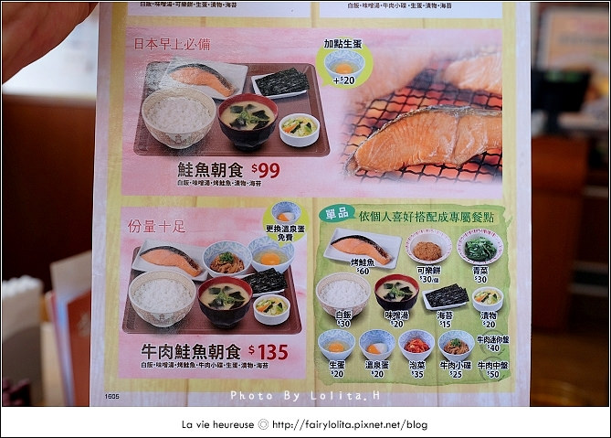 一併附上早餐Menu,59元的起手價還算是挺可愛的,另外也有可樂餅、牛丼及鮭魚等等的食材套餐,如果你喜歡再吃得豐富些,也可以很霸氣給它全部都上!