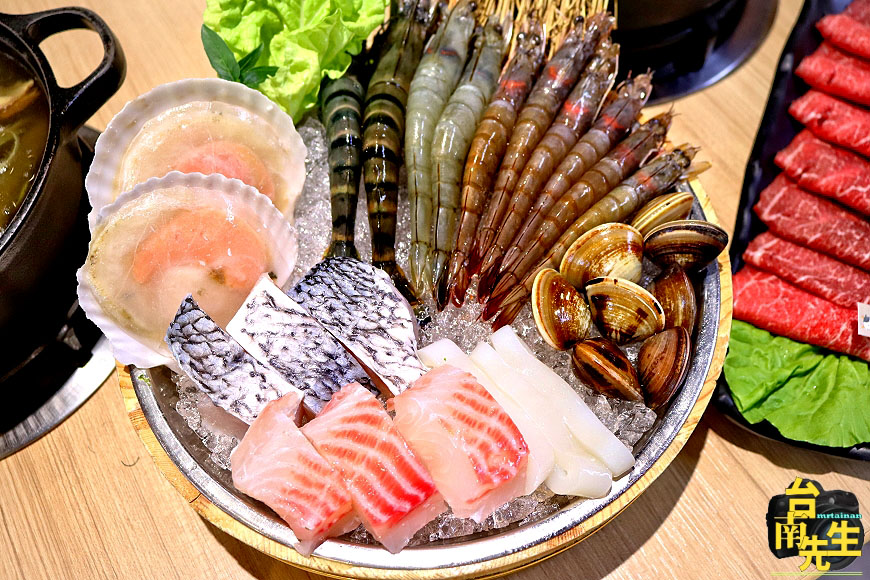 雙人極盛套餐:內含極盛海鮮拼盤、湯底x2、肉品6選2、附餐x2、菜盤x2。鍋子是使用日本知名有400多年歷史的南部鐵器鑄鐵鍋,導熱速度快且保溫效果佳,烹煮過程會釋放鐵離子溶入食物中,兼具美味與健康