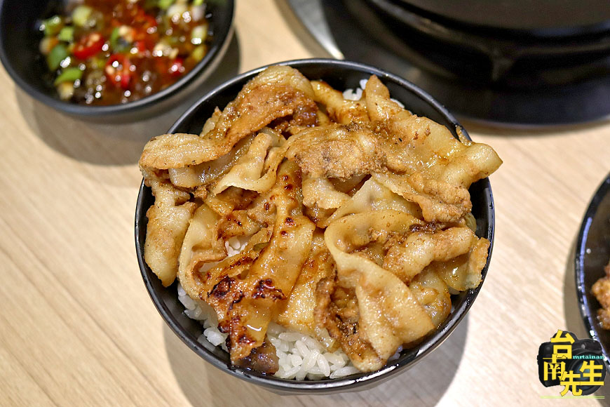 燒肉丼飯:覺得副餐配白飯太無聊的人,可加價升級成燒肉丼飯,燒肉選用台灣培根豬,肉質柔嫩中又帶有彈性,搭配鹹甜交融的特調醬汁,越吃越開胃