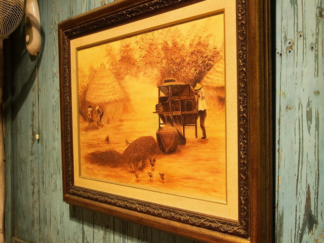 牆壁木頭刷成淺藍色.. 掛著畫..