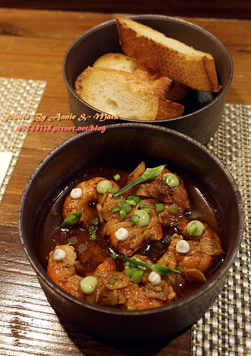 以蒜片+特製醬汁來燉煮蝦子,再酌以些許碗豆泥來提味,