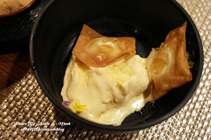 這創意甜點可特別了,碗裡是酥炸餃子皮包裹鳳梨餡+一球冰淇淋