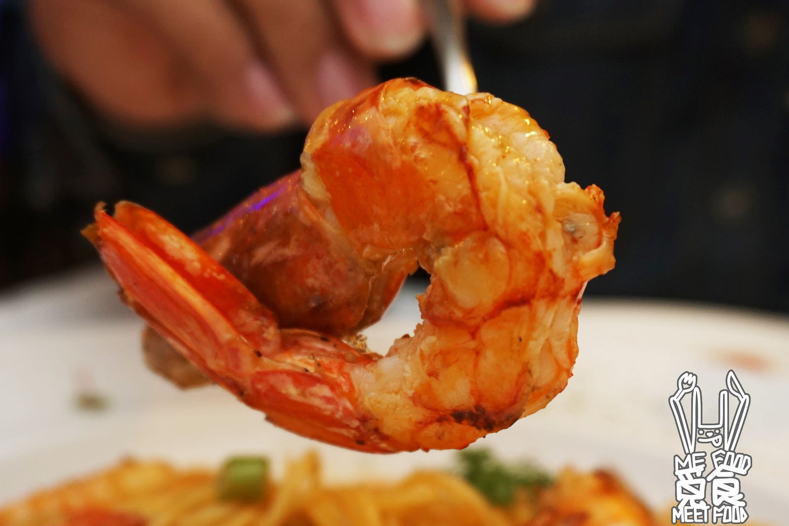 可以看到充分沾染了醬色的義大利麵 上面擺上了天使紅蝦跟白蝦