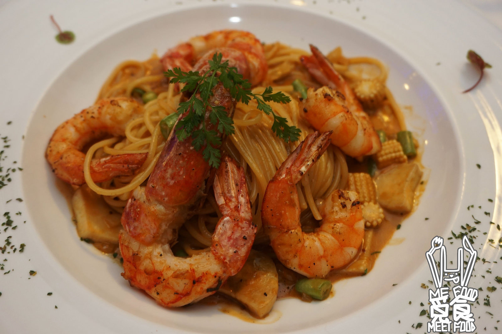 當日點餐:龍蝦風味醬汁鮮蝦麵、香煎松阪豬襯胡麻芥末籽奶油醬汁