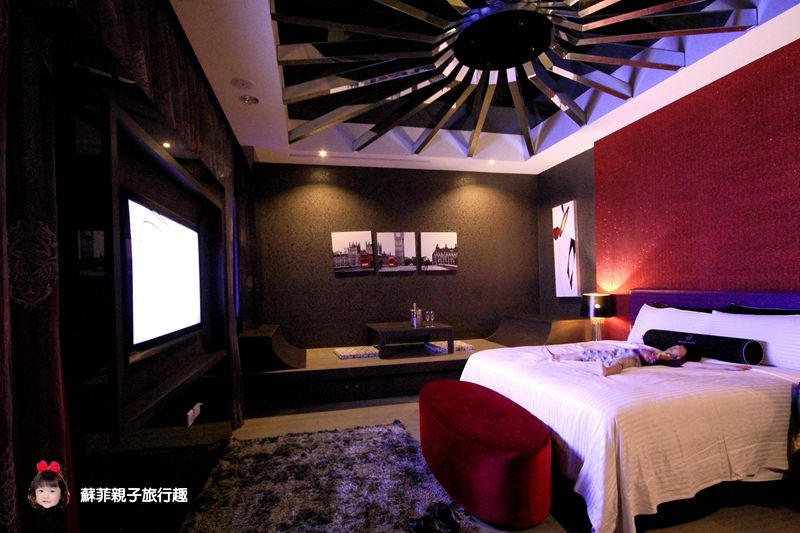 電視牆與床鋪間鋪著銀灰色的長地毯,搭配上大紅絲絨長椅,顯得高貴典雅~