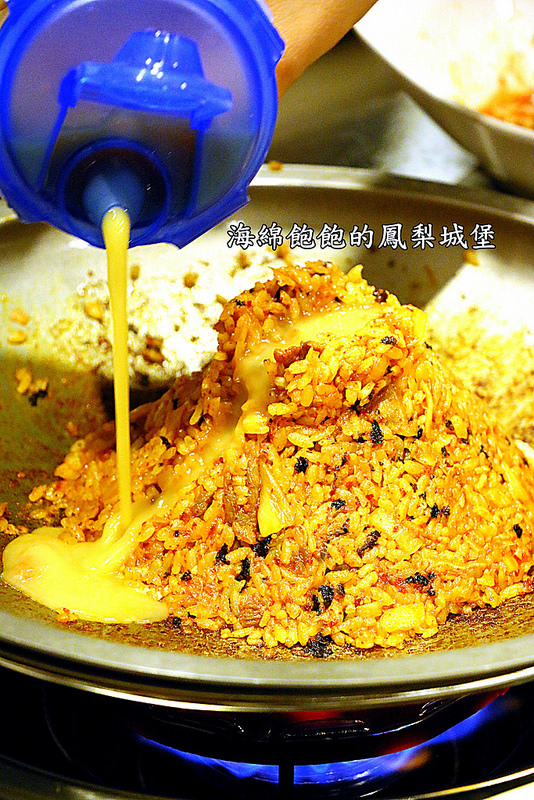 將有豬肉末、洋蔥、泡菜的特製醬料加入白飯拌炒