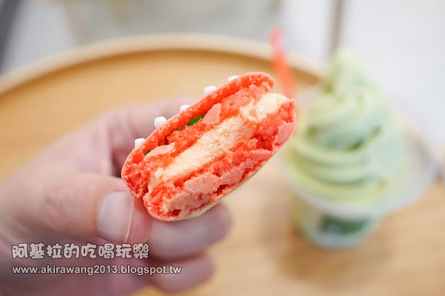▲草莓造型的馬卡龍有著不一樣的香甜口感,不會因為顏色鮮豔就有怪怪的味道,一樣是非常好吃,令人捨不得吞下去啊。