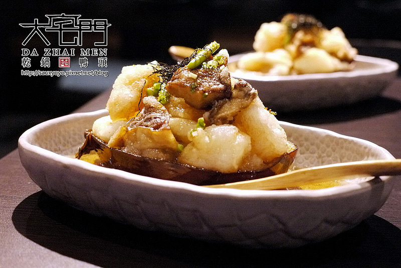 上面則是酥炸過的香菇、花枝、蝦仁以及蟹肉,要吃的時候要使用湯匙從底部挖起來,才可以吃到茄子與上層的菇類、海鮮融合的美味口感,