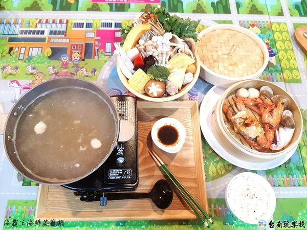 我已經將蒸籠內的海鮮食材蒸熟了,接下來滾燙的高鈣魚骨高湯接下來就把菜類及肉類放進去即可,這下山珍海味都準備好了!就等著食客我來動手了!好開心。
