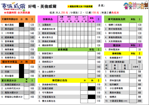 說真的,若撇開小朋友遊戲區不管,是單純來吃飯用餐,個人覺得來英倫威爾吃飯也是種不錯選擇,因為有些東西不錯吃,而且有些都是外面沒看過的菜單或稍為誇張的餐點這裡也是有很多特色餐點也以吃,若不排斥小朋友遊戲嬉鬧聲。