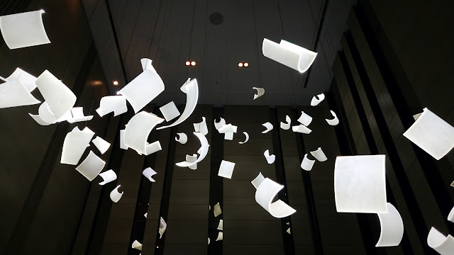 進到高挑設計的酒店大廳,映入眼前的便是如一陣狂風吹來,飛灑在半空中的紙張造型發光板,還滿吸睛的。