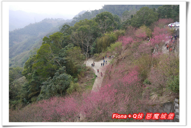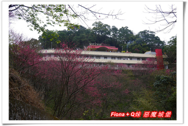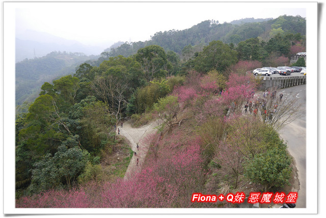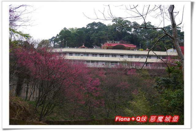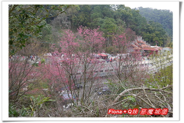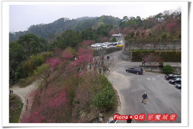 從宮廟前方的廣場向下看,剛好可以看到斜坡上種植的一團團燦爛櫻花球,停車場周邊環繞的櫻花也不遑多讓,紅花綠樹,將整個山頭點綴得十分繽紛,我好喜歡這種環繞式美景,視野非常棒 !