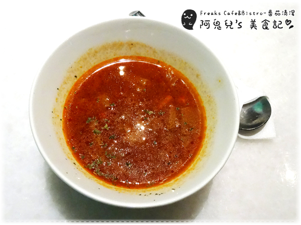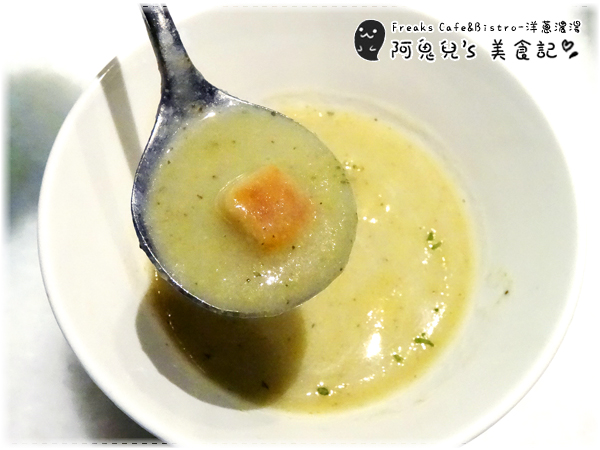 濃湯的部分有加入些許麵包丁,口感很酥脆,濃湯的質地我覺得很特別,