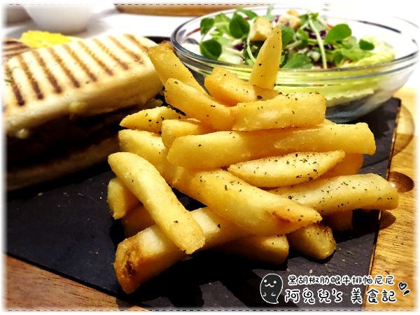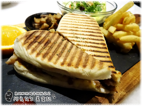 除了主角帕尼尼,一旁還有沙拉、杏鮑菇、柳丁和薯條,絕對可以吃得飽