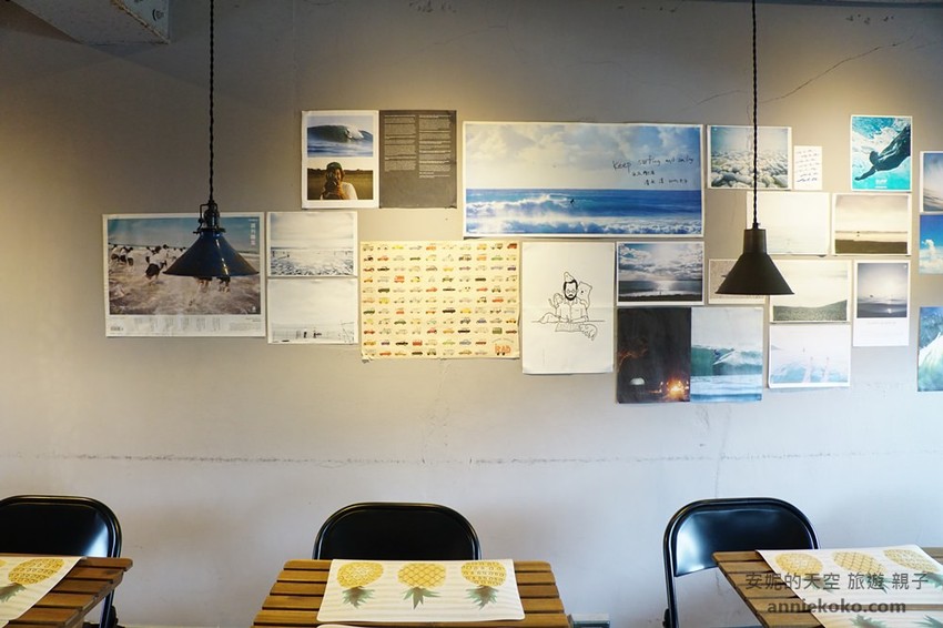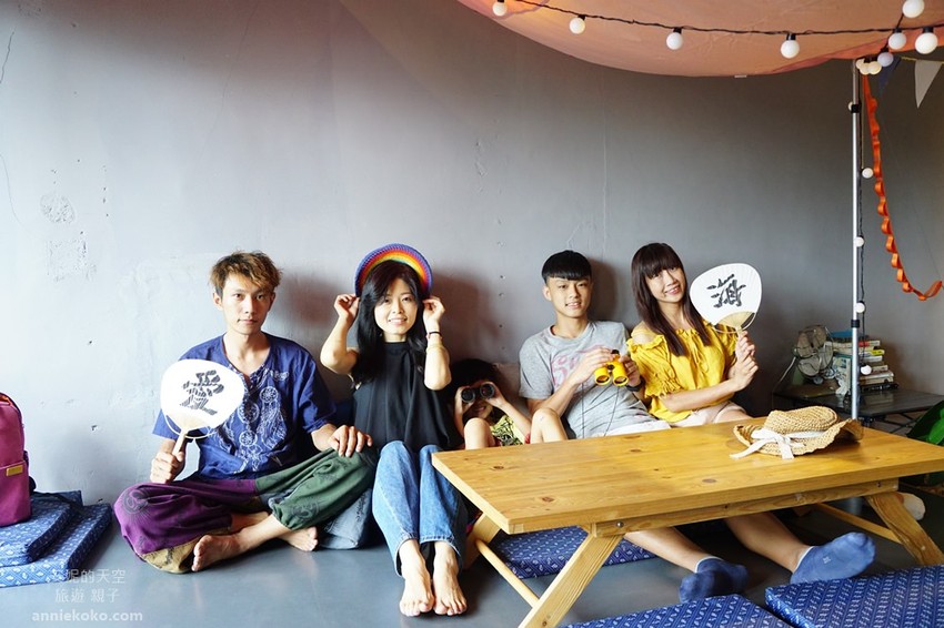 靠北過日子共有三層樓,一樓除了吧檯之外,還有小小的販賣區,二樓是最主要用餐空間,三樓則有半露天可以看海的用餐平台,天氣不熱的時候,到三樓的確是蠻舒服的,這天非常幸運,我們獨坐在這一區塌塌米,塌塌米區座位沒有很好坐其實,但我好喜歡這裡的擺設,彩色的帳篷加上點點燈泡,好有在戶外野餐的氛圍,超多舒服的抱枕可以讓我們又抱又靠的,真想要就這樣懶洋洋的坐在這裡一下午了。