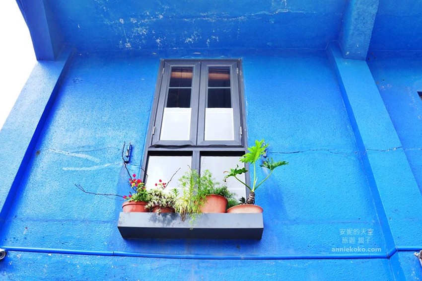 藍色的外牆窗台點綴著盆栽,很有異國風情。