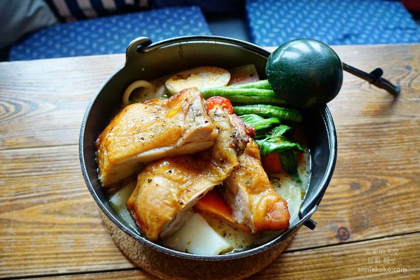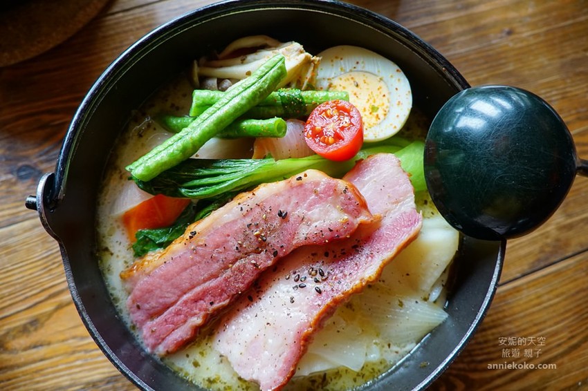 靠北過日子的烏龍麵配料非常豐富,裡頭充滿了蔬菜:胡蘿蔔、洋蔥、馬鈴薯、菇類、各類蔬菜、以及水煮蛋,烏龍麵奶油的湯頭很濃郁,主配料培根非常大器,培根很厚實,粉嫩的肉質軟嫩多汁,一碗吃完真得會超飽。