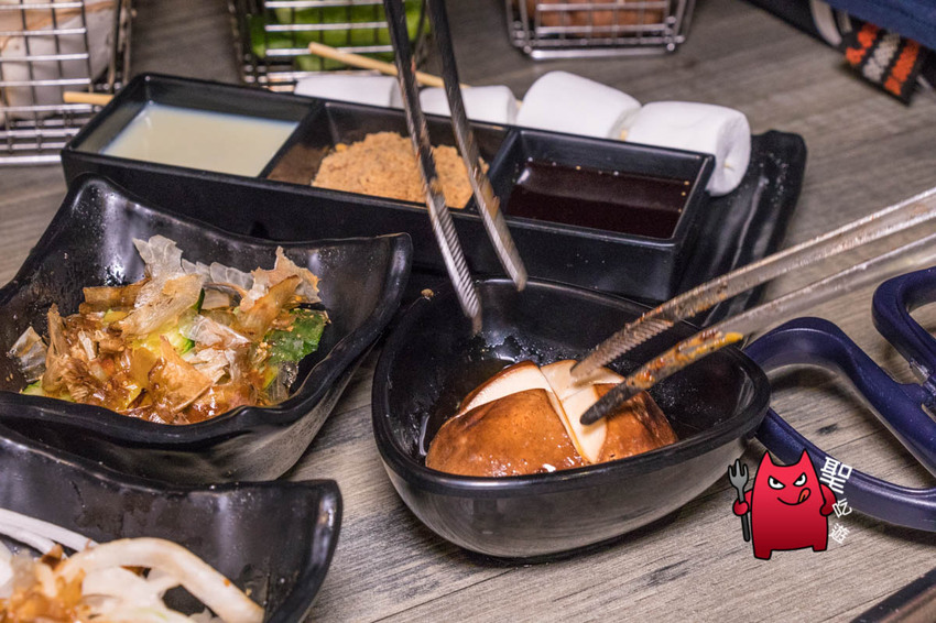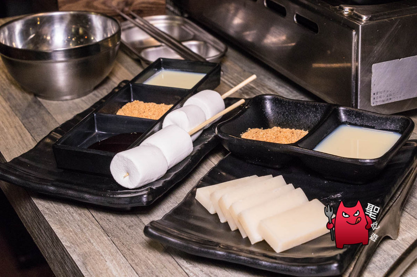 甜點這邊提供日式煉乳烤年糕、日式花生烤年糕、烤巧克力棉花糖、烤煉乳棉花糖等四種口味,也可以任意組合搭配成綜合。