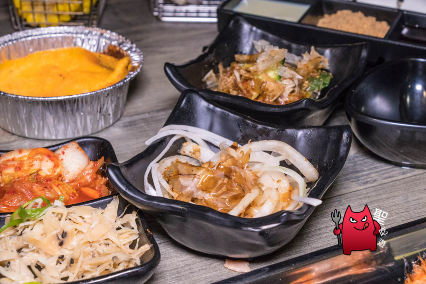 入座後店家都會先送上小菜,當天送上的分別是泡菜、和風小黃瓜、洋蔥以及牛蒡絲跟泡菜,可以當個開胃小點,或是拿來當生菜包肉的配料都蠻適合的。
