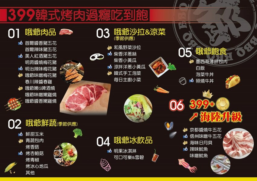 燒肉哦爺區分四種價錢,分別是399吃到飽以及499吃到飽。