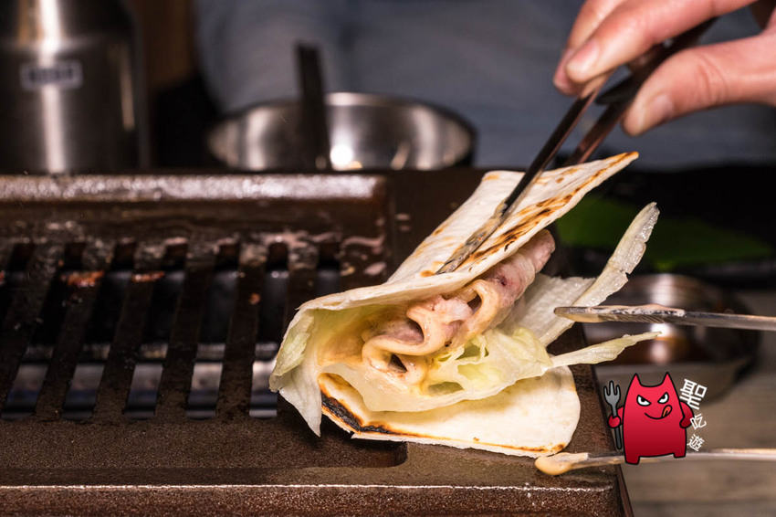 這裡牛五花有趣的地方是建議沾上起司後,再搭配墨西哥薄餅跟生菜一起吃。