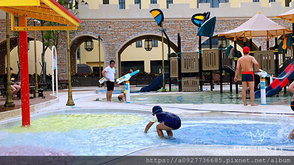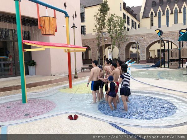 戶外的部分也設有兒童戲水區,戲水區設有小滑梯、大水桶,動物造型泡泡機⋯等,遊樂項目