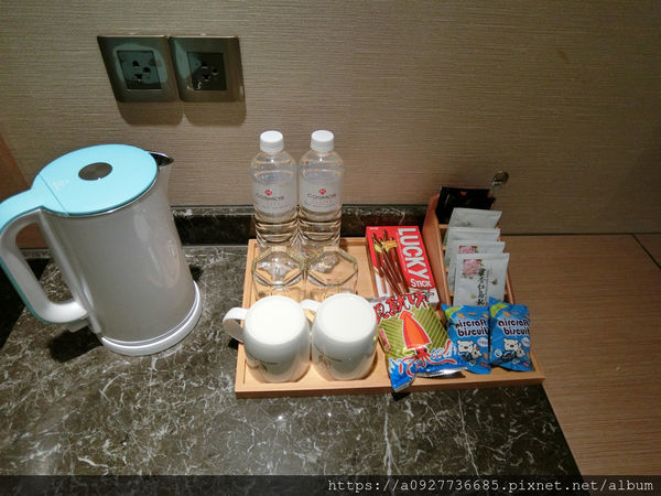 房內準備了茶包、餅乾、咖啡包和煮水壺