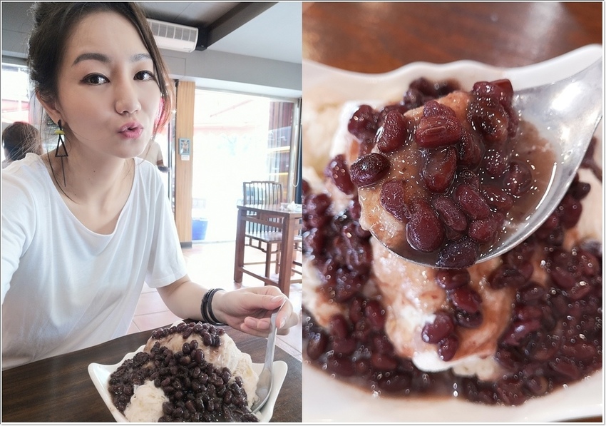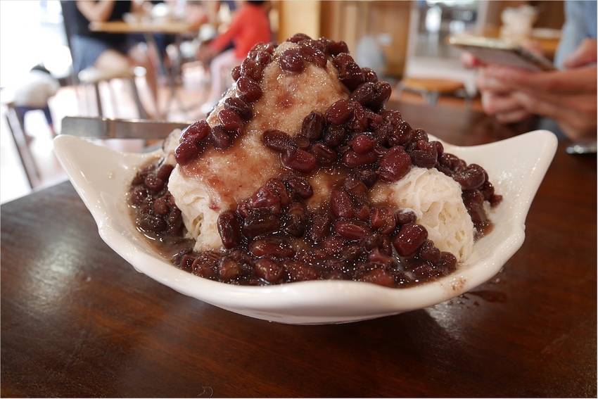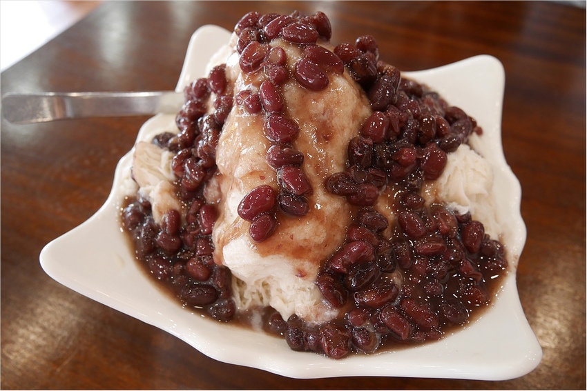 看這雪花冰上淋滿了紅豆,紅豆多到像瀑布一樣往下流,側邊看就好像一座小山呀