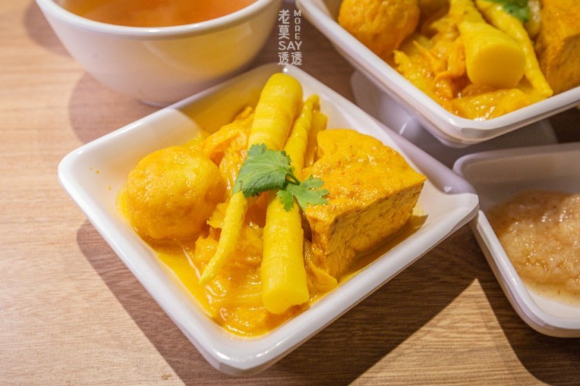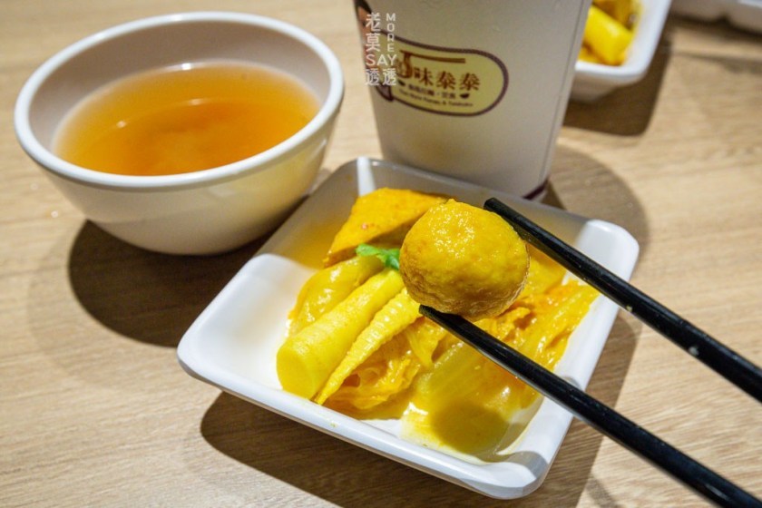 這次兩道餐點附上的都是咖哩口味的小菜。香濃的黃咖哩搭配上箭筍、白菜、魚蛋和油豆腐,是南洋風味和台日料理混搭後,所蹦出的新滋味!