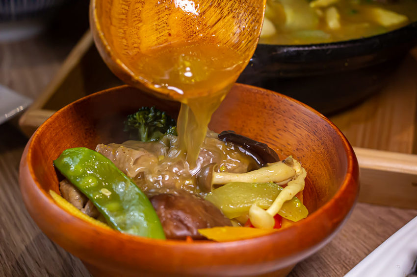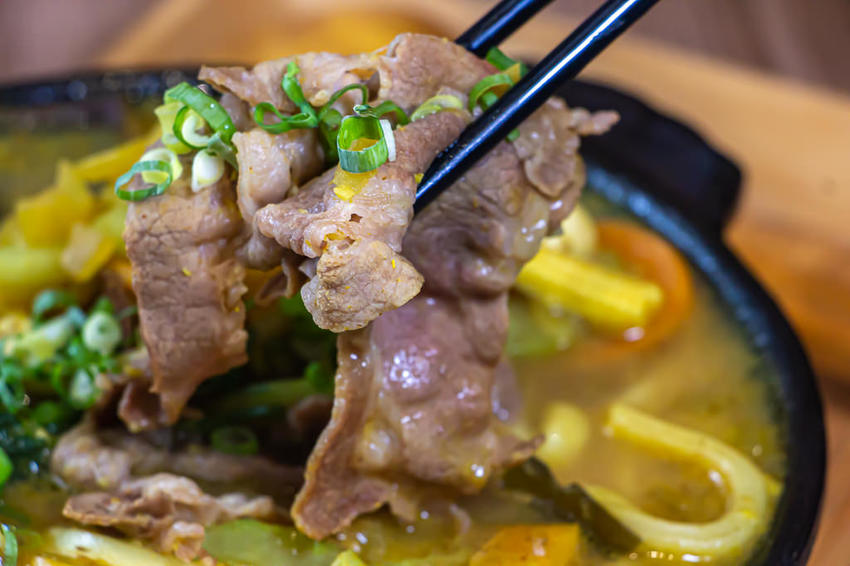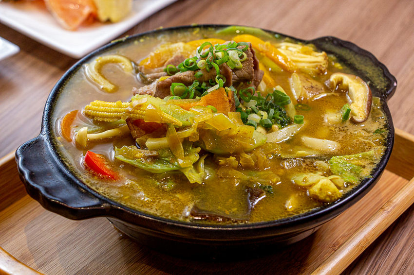 而安曇野食卓的燒鍋湯底均是使用北海道昆布、蘋果、雞高湯與鮭魚骨熬煮而成的湯頭,雖說湯咖哩本身的香氣很是濃郁,可入口喝得到清爽滑順,讓人忍不住一碗接著一碗。