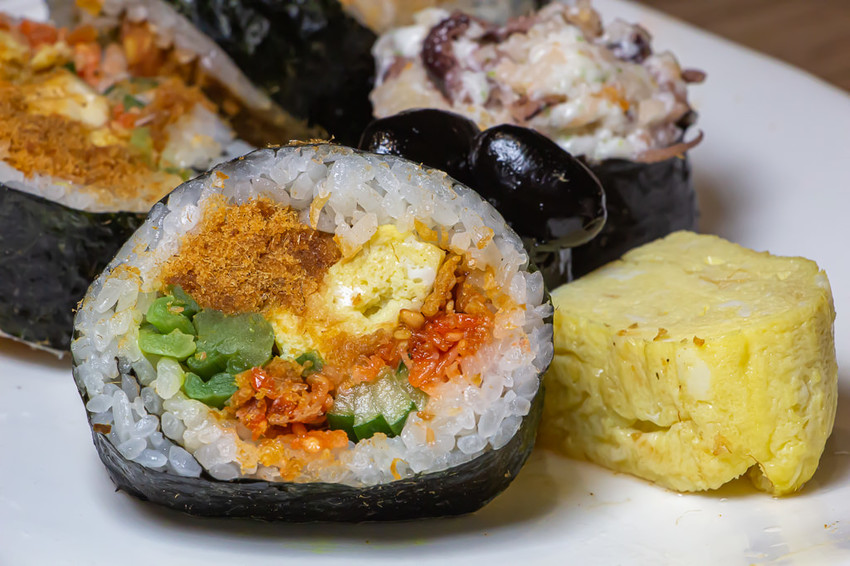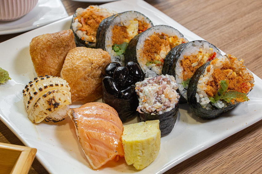 海苔肉鬆堅果壽司,裡頭的堅果極為爽脆,吃在嘴裡除了增添了一抹香氣,也多了幾分熱鬧,加上壽司裡包著微酸帶著脆口的貢菜更是開胃,而一旁的玉子燒香甜濕潤度很夠,一口1個顯得有些不過癮,下次要單點一份才是。