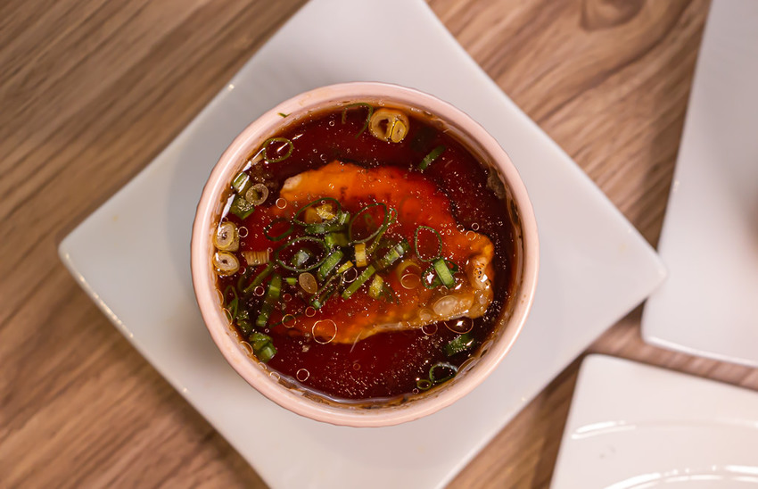 重點是這高湯的顏色很深卻不會過鹹,加上炙燒後的油脂融入在柴魚高湯裡,入口清香更多了份溫潤感,吃起來滑順的蒸蛋更是兒子的心頭好,沒一會兒這鮭魚茶碗蒸便已全數解決。
