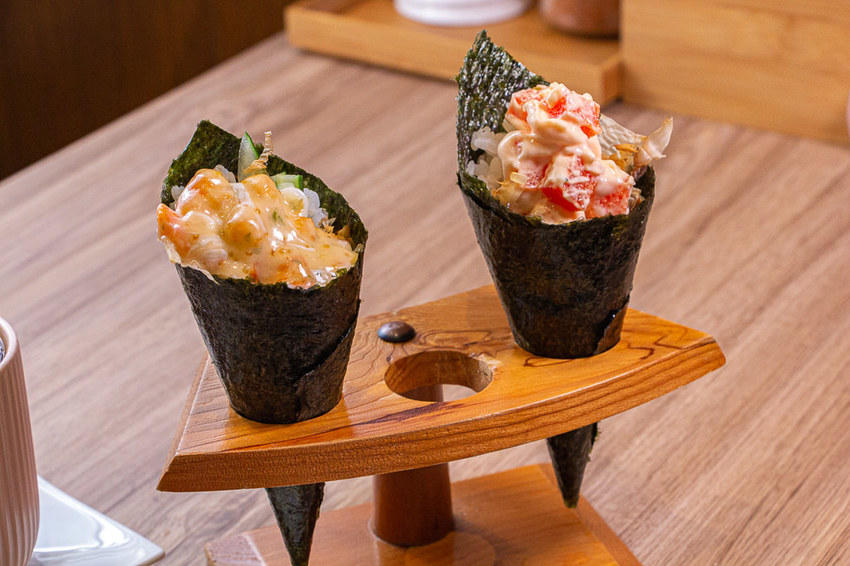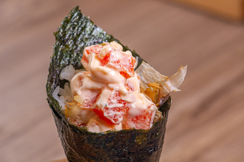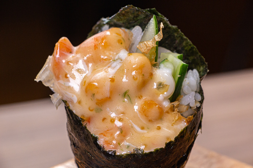 魚子手卷吃起來帶著QQ口感,搭配上醬汁後顯得微微的香甜,裡頭還有包覆些醋飯,增添飽足感。