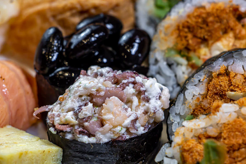 章魚沙拉軍艦上頭的料一整個就快滿出來,海苔完全就要HOLD不住呀!本以為口感會很是彈牙,沒想到頗為細緻,鮮味也有出來,對孩子或老人家而言是很容易入口壽司。