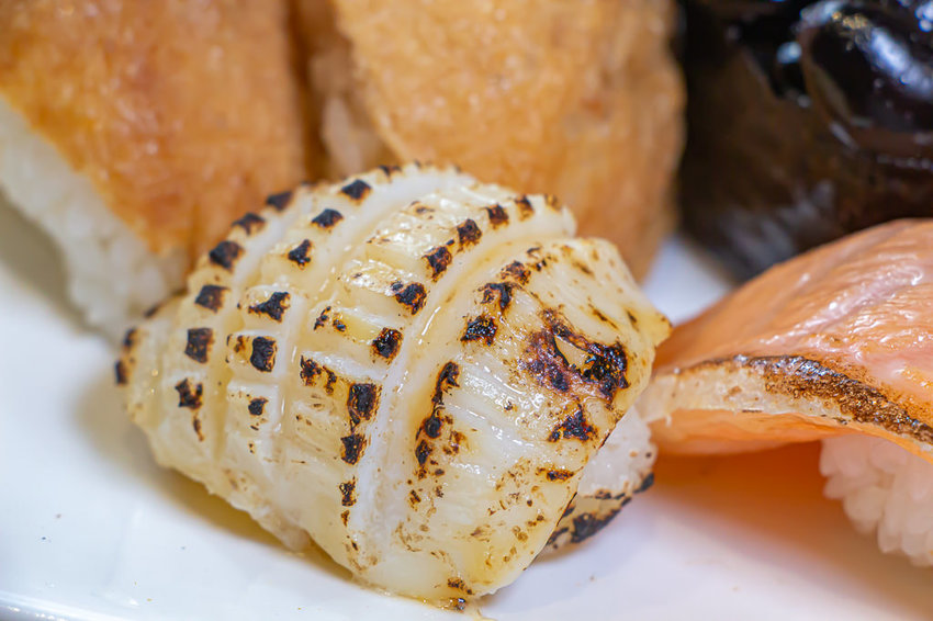 炙燒後的日本花枝帶著焦香,2、3分熟的口感帶有脆度,富有咬勁,鮮味不在話下!而且造型超可愛的,讓人還沒吃之前就先被他的外型給收買了。