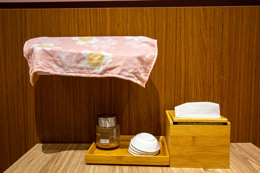 餐具則是懸掛在牆邊,一旁還有調味料、醬料碟與面紙,醬油則需要額外與店家索取,因為安曇野食卓提供的是店內特調醬油,要放置在冷藏處來維持鮮度。