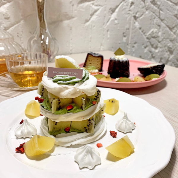 帕芙洛是由蛋白霜、抹茶鮮奶油、奇異果塊堆疊而成