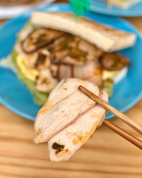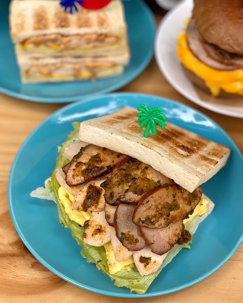 內含:吐司兩片、一種醬料、四份肉類、歐姆蛋、生菜