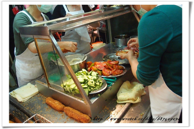 旁邊的人接手後抹上厚厚的美乃滋 擺上蕃茄片 黃瓜絲 滷蛋和火腿塊動作一氣呵成又快速