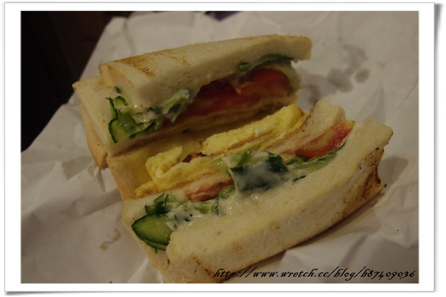 吐司裡夾著黃瓜片和蕃茄片再配上美乃滋和 超厚的煎蛋 乍看感覺跟營養三明治差不多