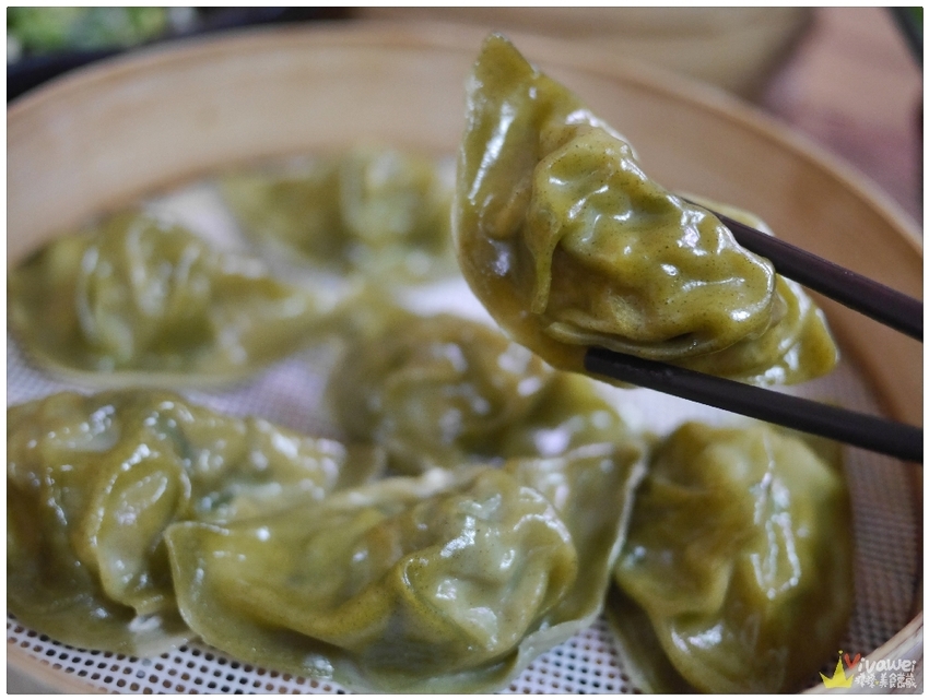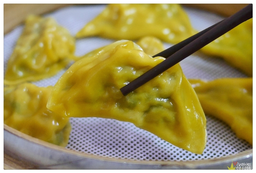 ▲黃色的九層塔蒸餃,外皮是加了南瓜汁,蒸餃的個頭都蠻大顆,趁熱吃時要小心燙口!